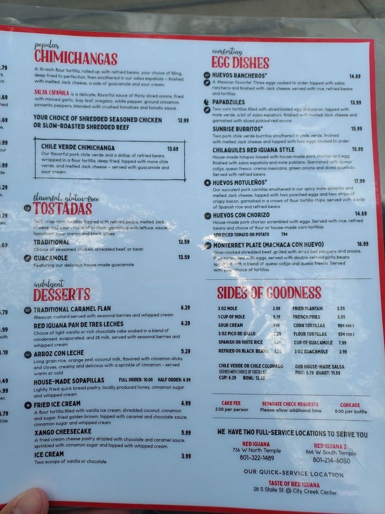 Introducing the menu at Red Iguana, a Mexican restaurant in Salt Lake City, UT, is a truly vibrant culinary experience. This Latinx and women-owned establishment offers a wide range of dishes, from delectable enchiladas to flavorful mole sauces that have left customers raving. The menu includes vegan options and limited vegetarian choices, making it suitable for a diverse range of diners. Customers have praised the variety and quality of the food, with standout items like the mole sampler, quesadillas, fajitas, and the Red Iguana combo plate receiving high marks. The service is top-notch, the ambiance inviting, and the prices reasonable, making Red Iguana a must-visit for anyone craving authentic Mexican cuisine with a modern twist. From the charming outdoor seating to the friendly atmosphere and exquisite flavors, Red Iguana promises a memorable dining experience for all.